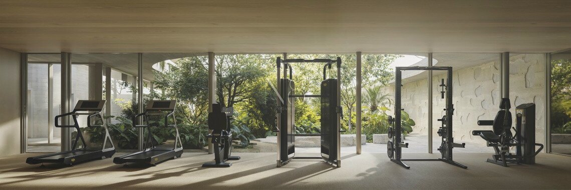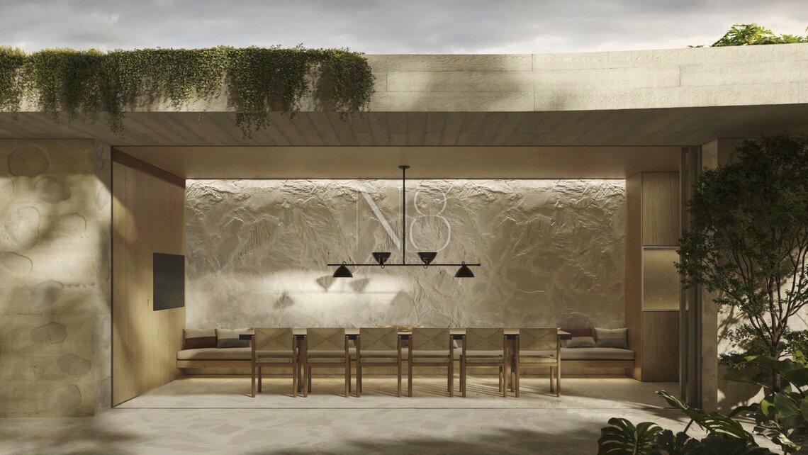 A luz atravessa a delicada trama dos brises e percorre amplos vãos, revelando formas puras e materiais naturais que criam uma atmosfera contemplativa e acolhedora.