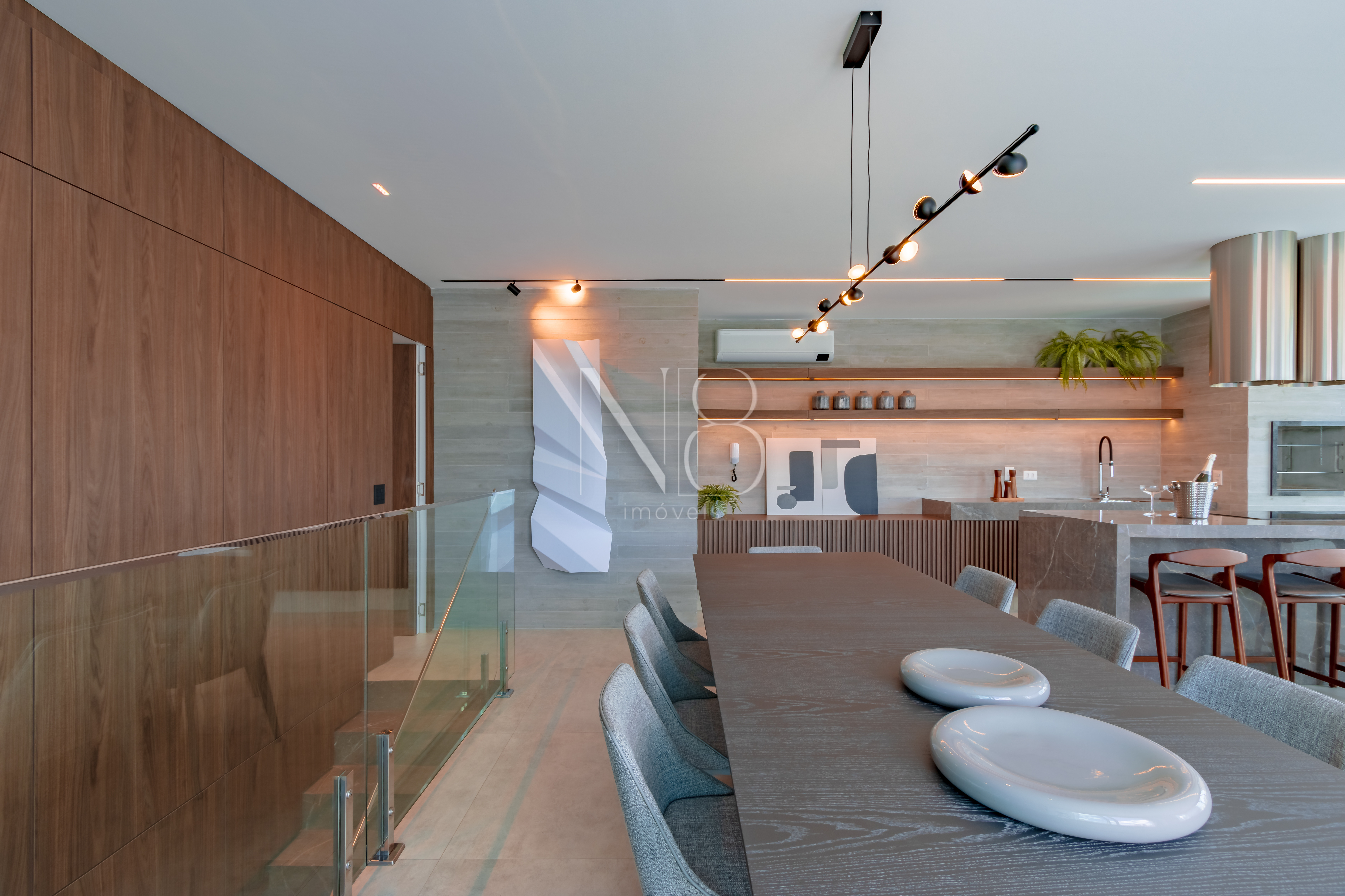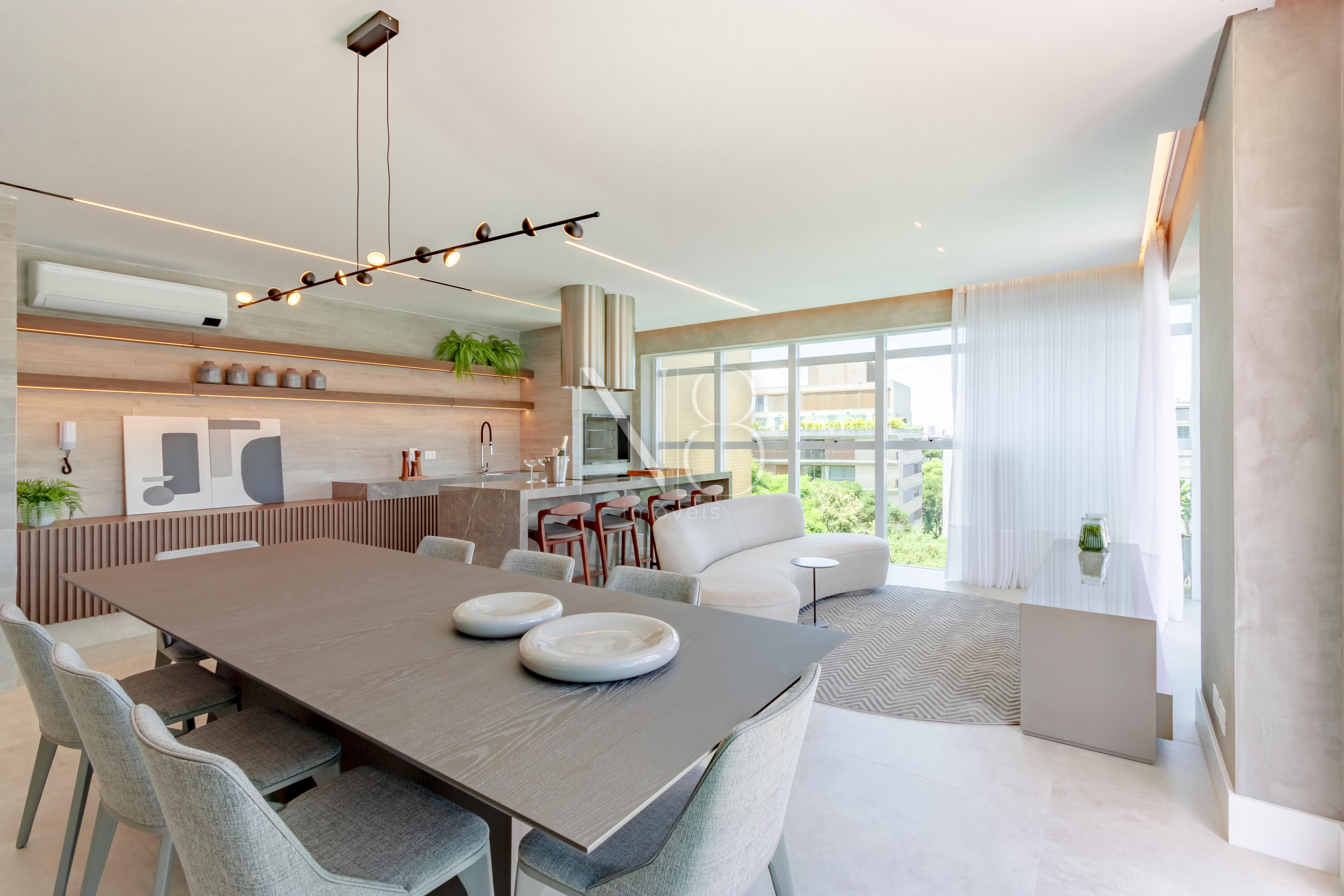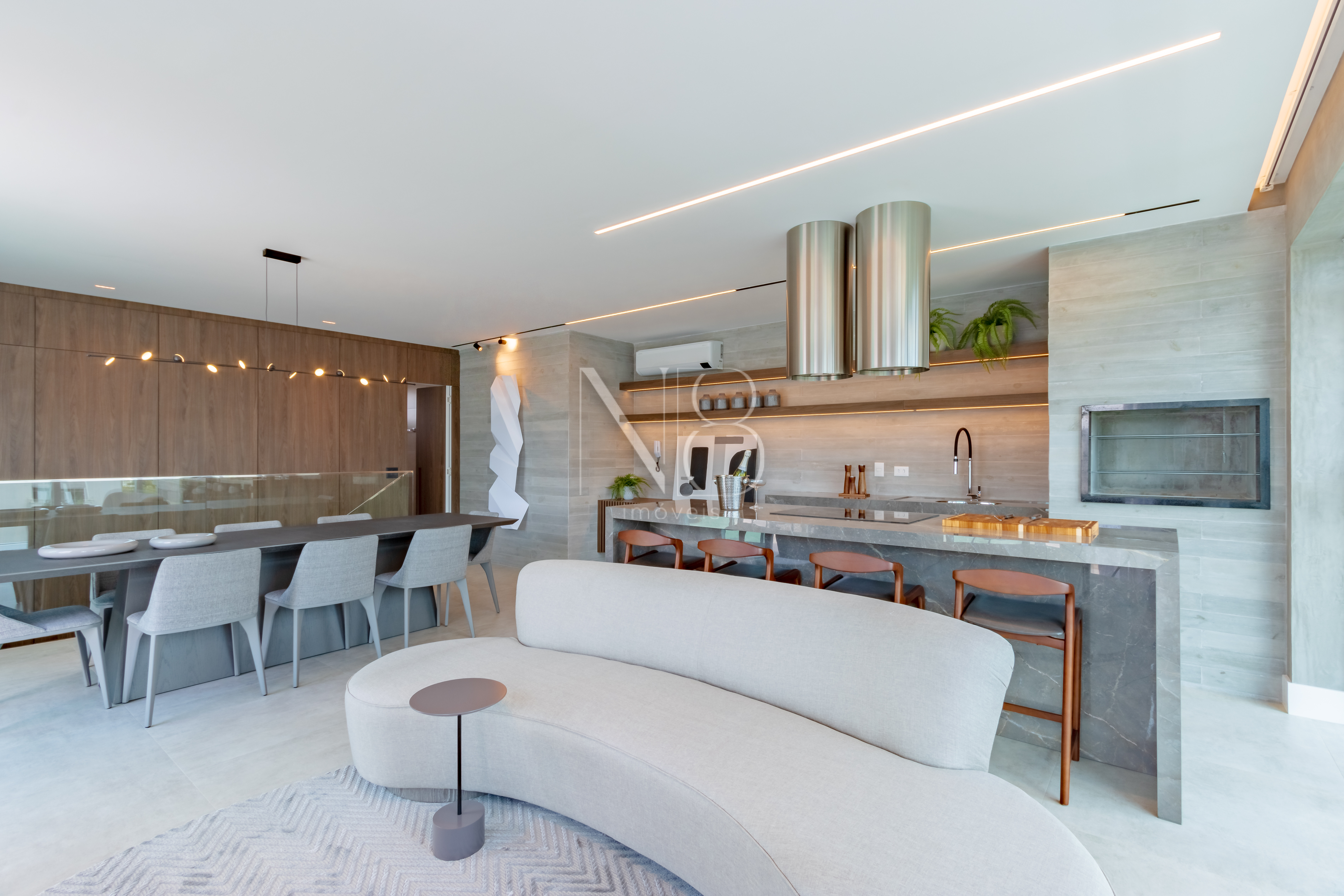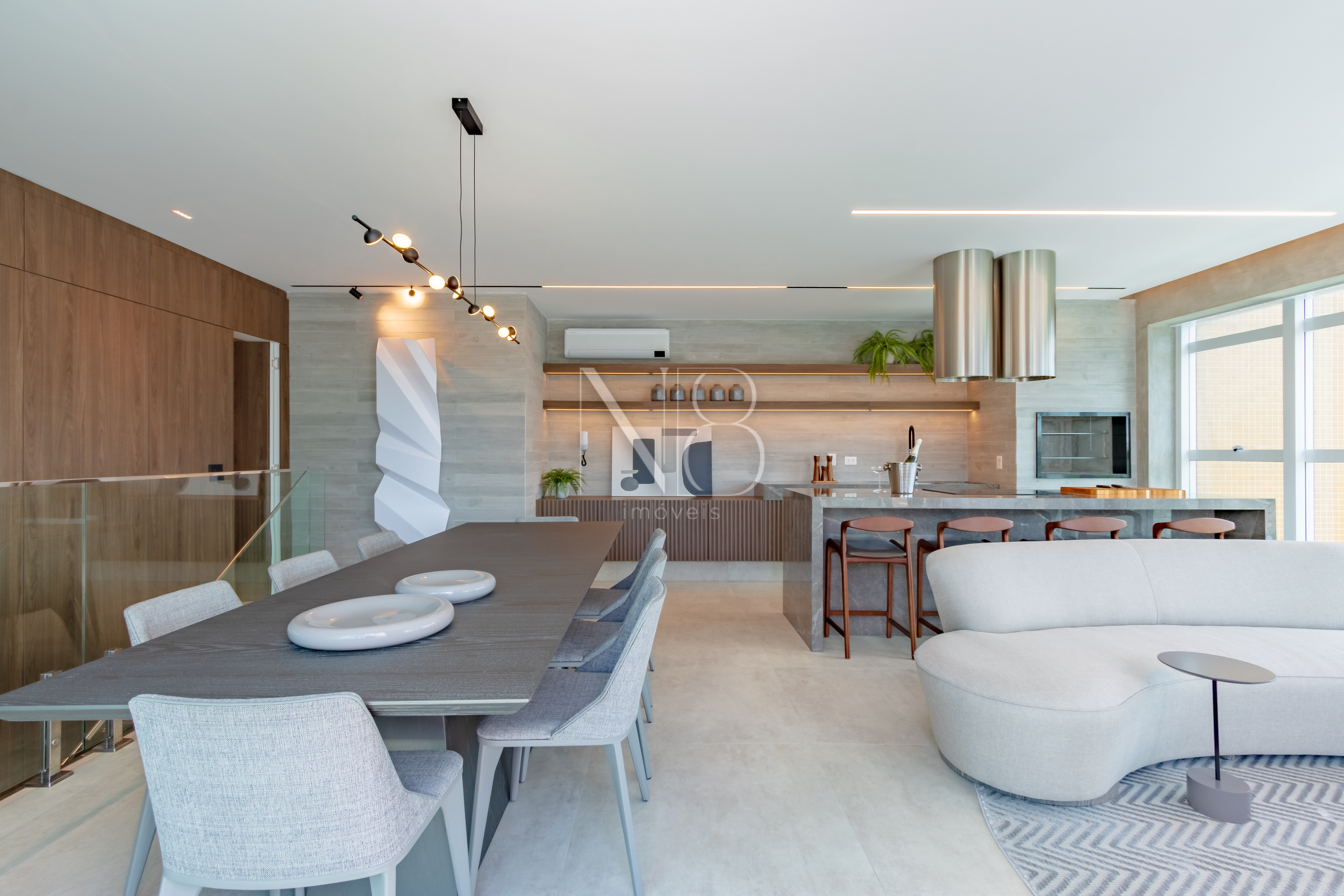 A área social é composta por uma ampla sala de estar e jantar integrada à cozinha, além de um lavabo e área de serviço com despensa e banheiro.