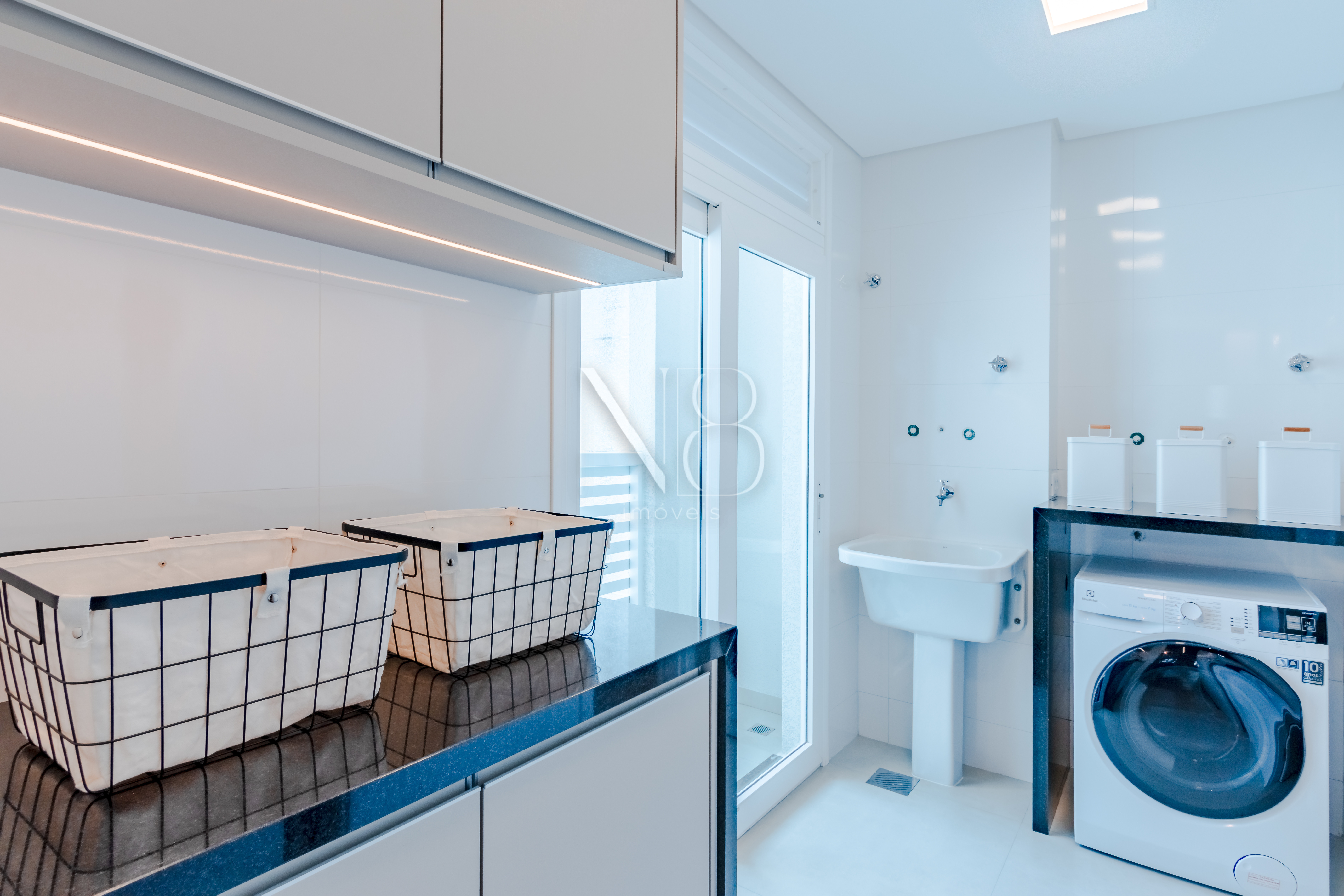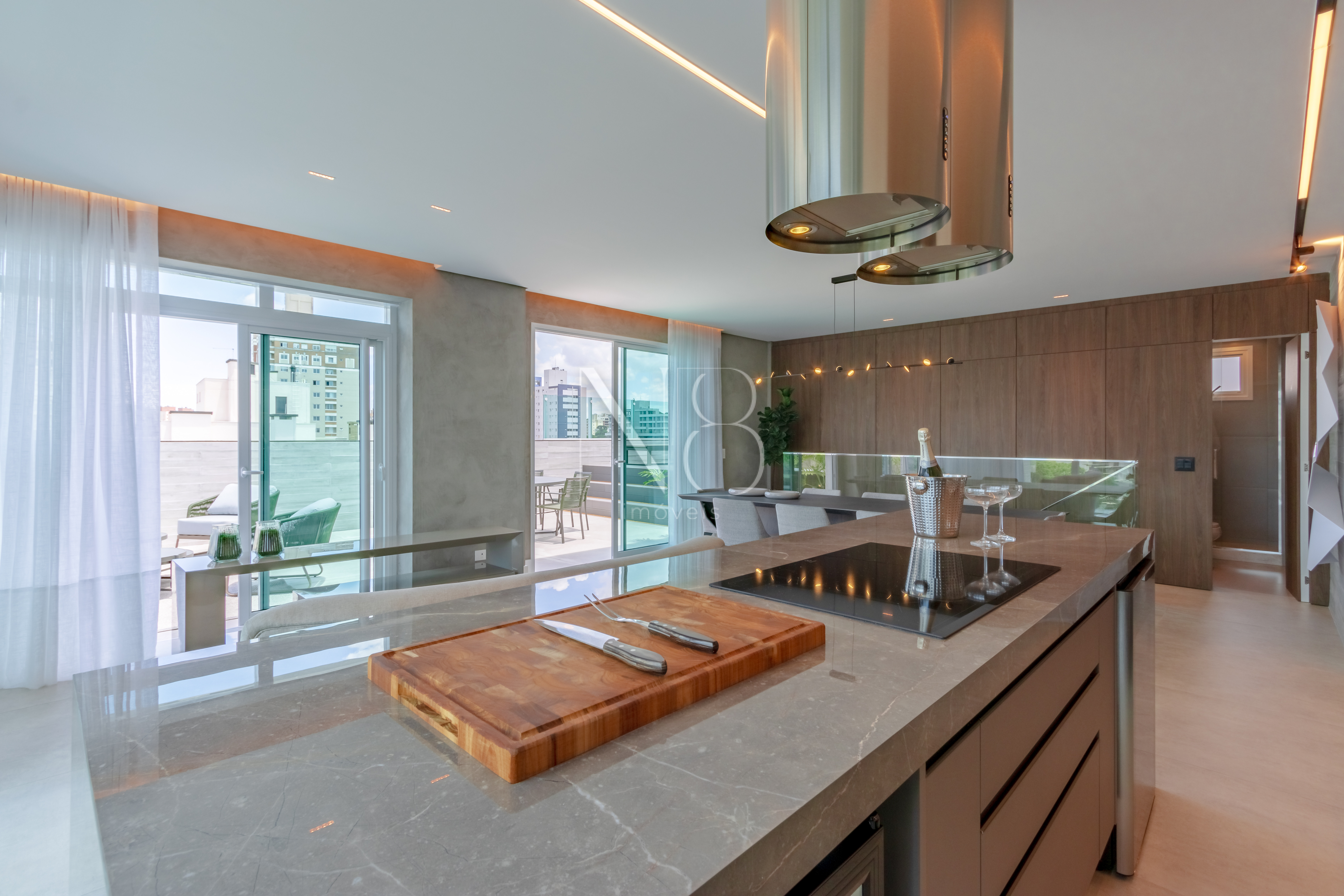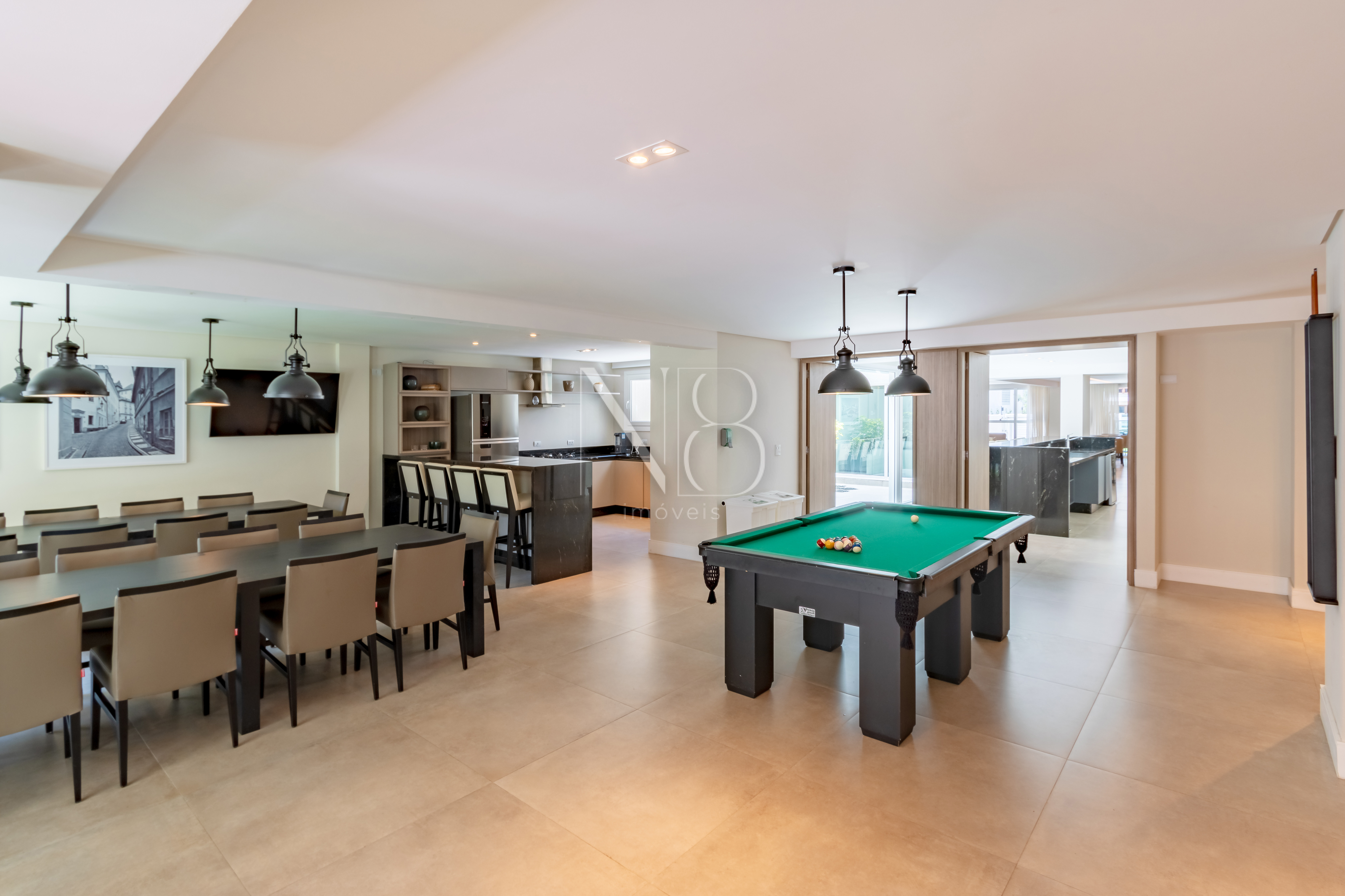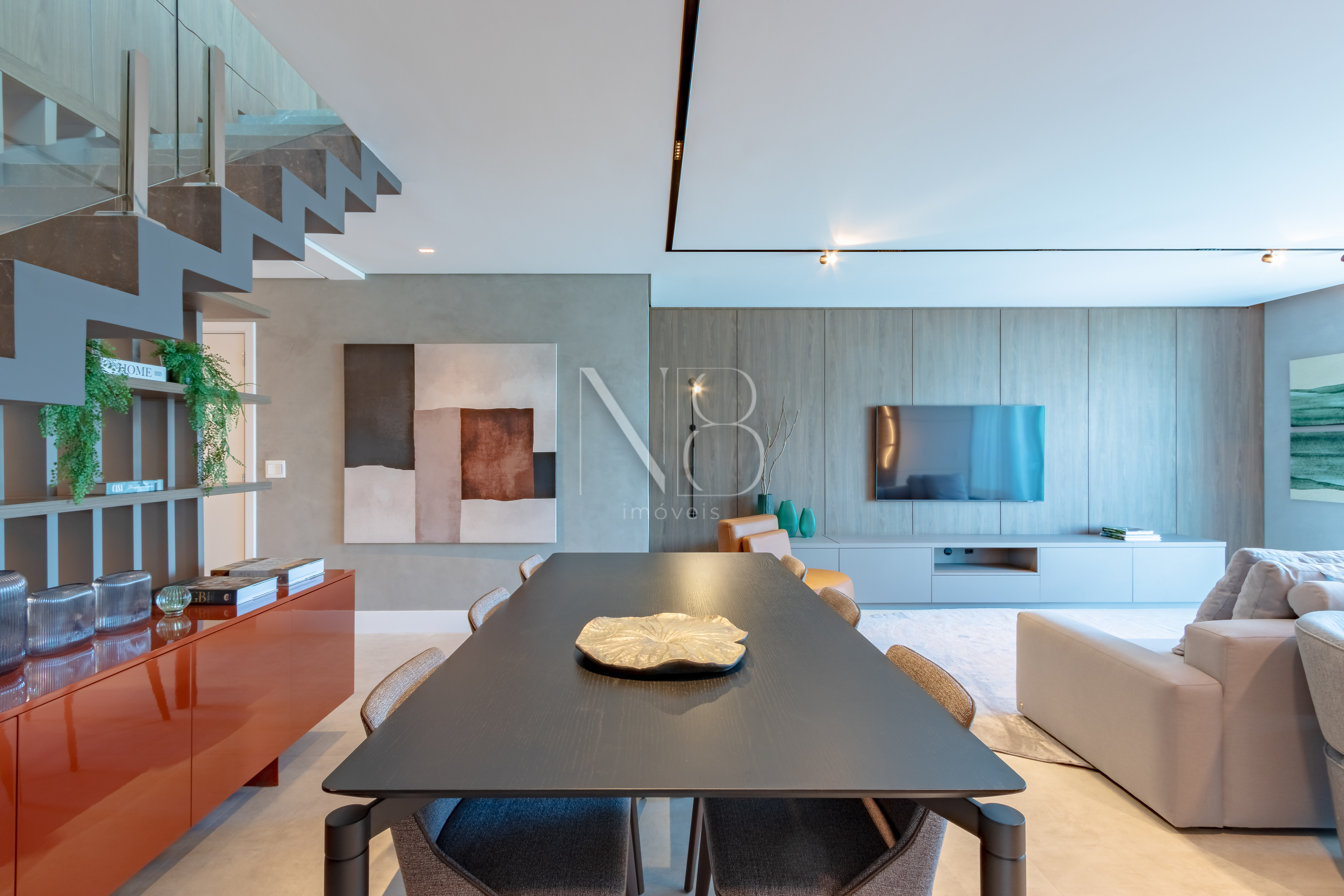 A área social é composta por uma ampla sala de estar e jantar integrada à cozinha, além de um lavabo e área de serviço com despensa e banheiro.