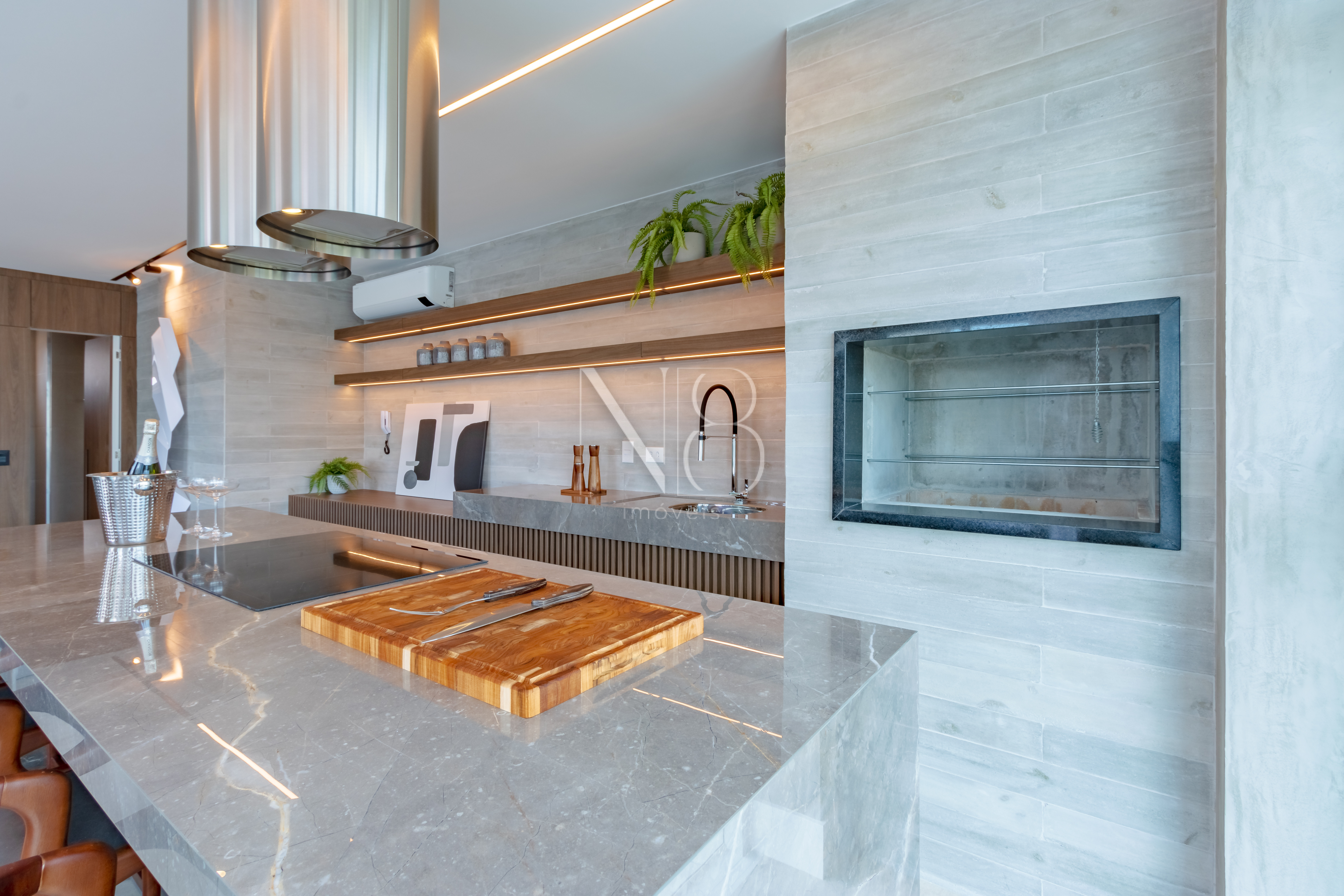 A sacada gourmet com churrasqueira à carvão oferece o espaço perfeito para momentos de lazer.